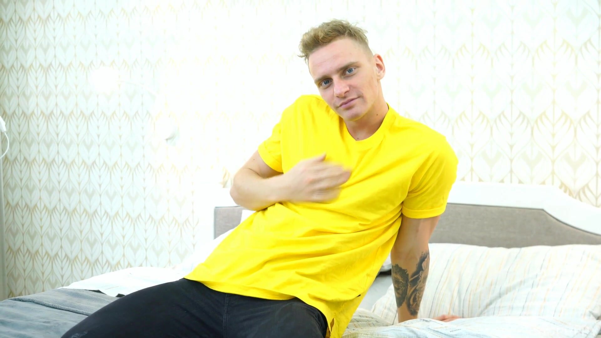 Hunky Martin Spell is a 22-year-old Russian twink who enjoys working out, music, dancing and of course playing with his cock. Within moments of him crawling onto the bed he's groping the hardening bulge of his cock in his tight jeans. By his own admission he jacks off at least twice a day, and even though he prefers that to be with a friend he's more than adept at taking care of himself. With his shirt removed we see his ripped abs, arms and chest. You can tell he likes to work out. He takes his time stripping out of his clothes. He slowly reveals his thick, uncut cock before rolling over to show off his tight, plump ass. By the time he turns around his cock is so hard, his foreskin slips over the swollen end and back again as he slowly jacks himself. Martin shows off in just about every position he can imagine before the pleasure becomes too much to hold back. After so much teasing he's relieved to squirt a thick and creamy load of jizz. He milks every drop out of his foreskin-hooded dick before turning to the camera one last time and giving us a cute little smile.
