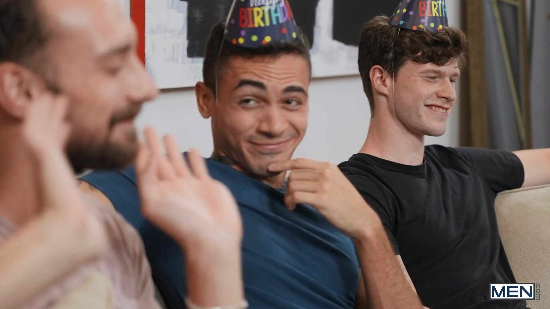 Finn Harding is supposed to be celebrating his buddy Johnny's birthday, but he's more interested in flirting with Ashton Summers and getting his nut instead! When it's time for cake, he follows Ashton to the kitchen and feeds him some icing, but when that doesn't seem to pique the handsome bottom's interest, Finn steals away with the new mouth-shaped stroker Ashton gifted to Johnny. As Finn is fucking the toy, Ashton creeps in and spies on him, and he sneakily takes the place of the stroker so Finn fucks his mouth instead! When the top figures out the swap, he puts Ashton on his hands and knees to fuck his hole, then pounds him in missionary. The bottom moans as Finn penetrates him in doggystyle, then rides Finn reverse until he cums. Ashton kneels to take Finn's big load on his muscular chest, right before they get caught by all their friends!