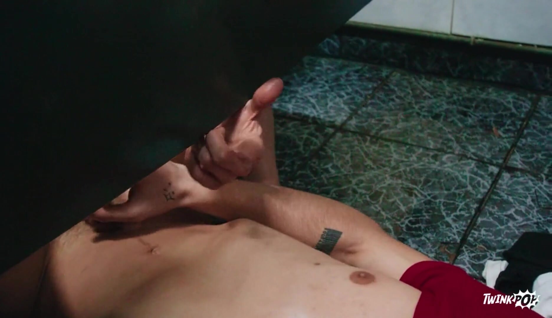 Twink Cyrus Stark gets pushed against his locker by college bully Angel Santana until he hides in the bathroom. As he's eating his lunch in the stall, he hears someone come in and start jacking off in the next stall. Not knowing who it is, when Angel Santana slides his legs under the divider Cyrus eagerly sucks him, then sits on that dick. Cyrus slides his ass into the next stall to get fucked doggystyle, then flips over and strokes his cock while the top drills him. The twinks can't believe who they've been fucking when Cyrus comes to Angel's stall, and the top face-fucks him, then pounds him against the wall before giving him a facial.