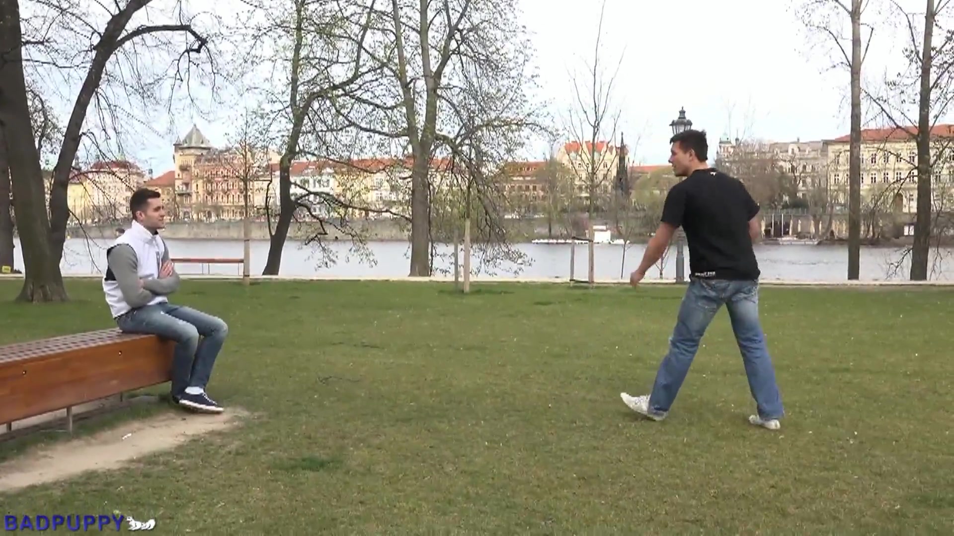 Lorenc Byro was practicing his jumping and vaulting when he did a running flip over the wooden bench on which Alan Carly was sitting. Alan was quite impressed with Lorenc’s stunts and when Lorenc came over and sat down by Alan they struck up a conversation. Alan asked Lorenc if he would be willing to show him a few tricks and with a twinkle in his eye Lorenc said he definitely had a few tricks to show him. We fade in on these two studs kissing and slowly stripping each other’s clothes off. Both of their cocks are rock hard and as they sit down on the bed with each other’s stiff cocks in their hands you can tell the chemistry is all there for these two. After some mutual cock sucking and sixty-nining Alan is all hot for Lorenc’s cock up his ass. He kneels over the bed and Lorenc shoves his thick, long cock right up Alan’s ass and then literally begins to fuck the heck out of Alan. From the time Lorenc’s cock enters Alan the pounding just does not stop. Alan flips over on the bed, Lorenc shoves his cock back up Alan’s ass and start fucking away again and Alan grabs his cock and starts jerking. Lorenc fucks Alan harder and Alan squirts a load of cum all over his six-pack abs and chest. Lorenc continues to fuck Alan even harder until he pulls out just in time, rolls Alan over and dumps a load of jizz all over Alan’s chest. Stick around for the shower scene portion where Lorenc and Alan lather each other up and their cocks are still hard as rocks.