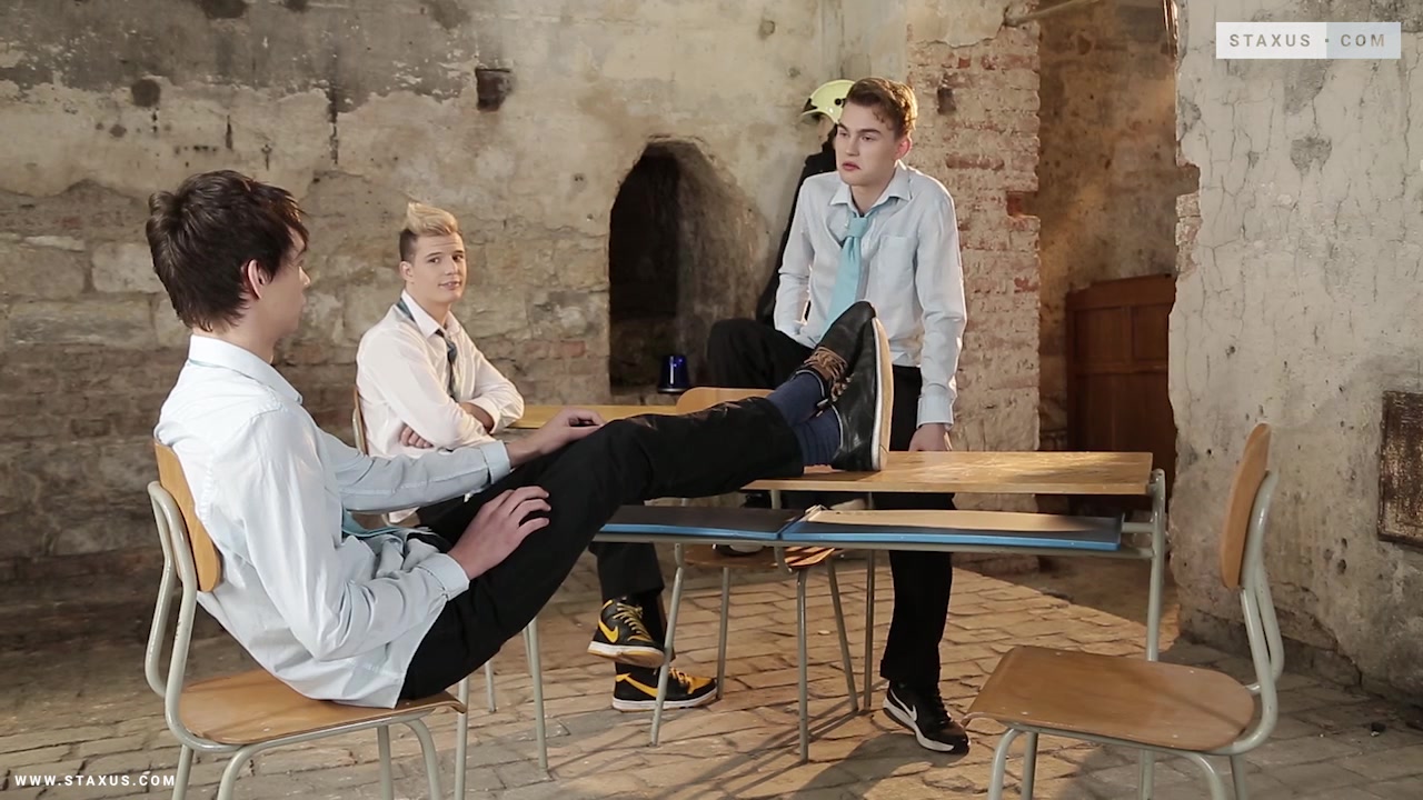 In the end that privilege goes to young Katz, who’s very quickly the centre of attention – getting his tight little hole rimmed and buggered in equal measure by both his horned-up pals. Given the circumstances it’s little surprise that he should soon be rupturing his balls in excitement; before Angel and James stand either side of him and proceed to whitewash his pretty face in a veritable tsunami of richly-deserved baby-batter!