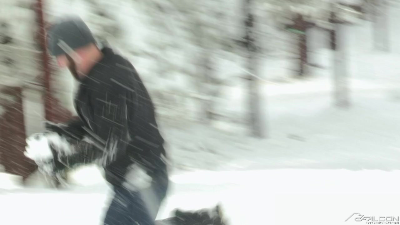 An overnight snowstorm has left drifts everywhere. Jimmy Durano and Chris Bines wrestle and have a snowball fight, then seek the warmth of each other's body indoors. When Jimmy's hard, he's big! His one-piece long johns are unbuttoned to the waist and tented by a raging erection that's way more than a handful for Chris. Chris attaches his lips to Jimmy's torso and covers every square inch on sculpted flesh with licks, nips and kisses. When he arrives at Jimmy's cock, he employs a combination of spit, mouth and hand to stimulate it from tip to base. Jimmy tumbles him onto a table and runs his tongue along the hair-lined crack of his ass, eliciting deep moans. Chris reaches back to spread his buns, making way for the huge cock that's about to rivet him. When Chris flips onto his back, he shows hard, convex pecs lined with faint dark hair. Jimmy pins Chris' ankles together and increases his speed and intensity, until Chris' cries echo through the room. A fast turnabout and Jimmy fucks Chris' face until his bodily red fluid vessels throb and cum flies like the blizzard outside the window.