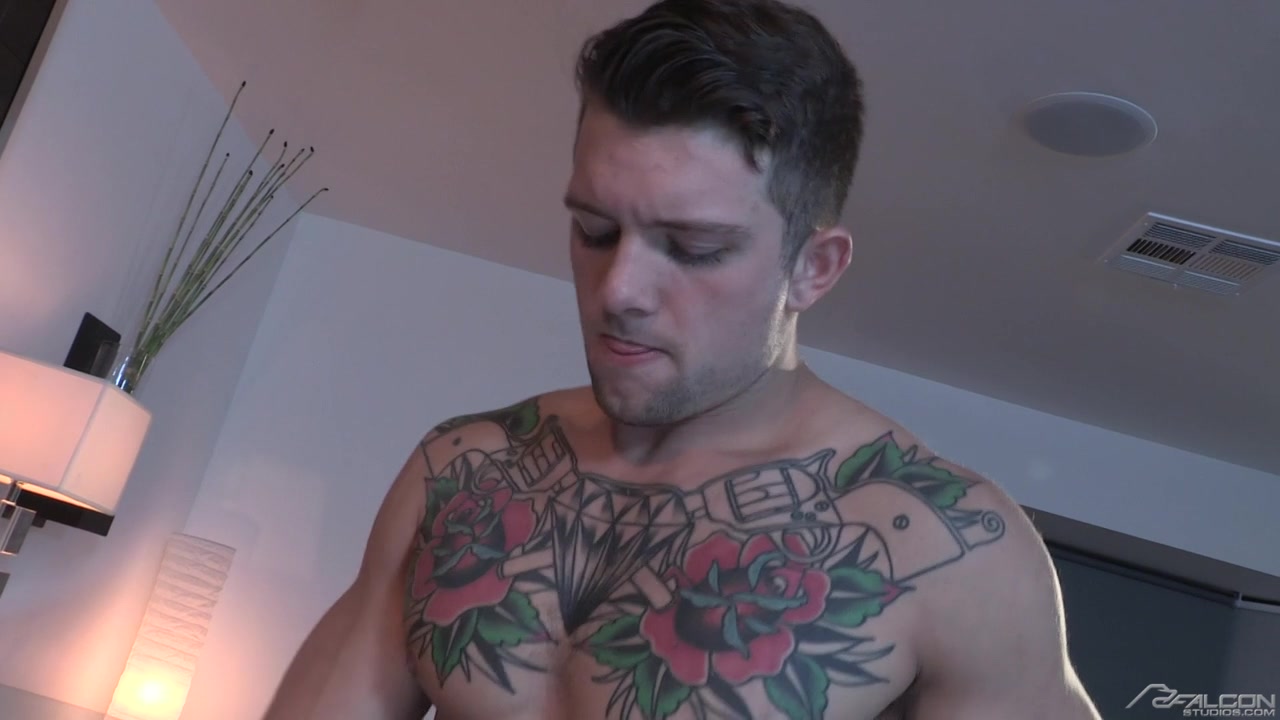 Sebastian Kross, searching for the bathroom in the packed club, accidentally stumbles into the alley. *Click* The door locks behind him. ‘Fuck!’ he exclaims–no chance of getting back in now. He pulls his dick out to piss in the alley when Colt Rivers leaves the club, heading for his car. Seeing Sebastian’s thick cock, Colt seizes the opportunity and extends an invite to hang out at his place. Sebastian accepts, and once inside, they waste no time getting down to business. Sebastian strips off his clothes, revealing ripped abs, his colorful chest tattoo, and his rock hard cock. Awed by the display of raw masculinity, Colt eagerly wraps his lips around Sebastian’s throbbing tool. But Sebastian wants more than fucking Colt’s face. As Colt rolls over on the bed, Sebastian pushes his face deep into the crack of Colt’s ass, using his tongue to spread slick saliva. When Colt is lubed and ready, Sebastian slides his dick into Colt’s tight hole and commences a fervent pounding. They move to a sit fuck, with Colt using his beefy legs to ride Sebastian’s rod. The rim of Colt’s ass stretches with each thrust as Sebastian keeps up his anal assault in missionary position. Colt grasps his cock and blows his wad across his chest with Sebastian still inside him. Then, Sebastian unleashes his own massive cumshot, which forms deep puddles on Colt’s abs. They rub their slick cocks together and then collapse side by side, reveling in the afterglow - Colt Rivers, Sebastian Kross