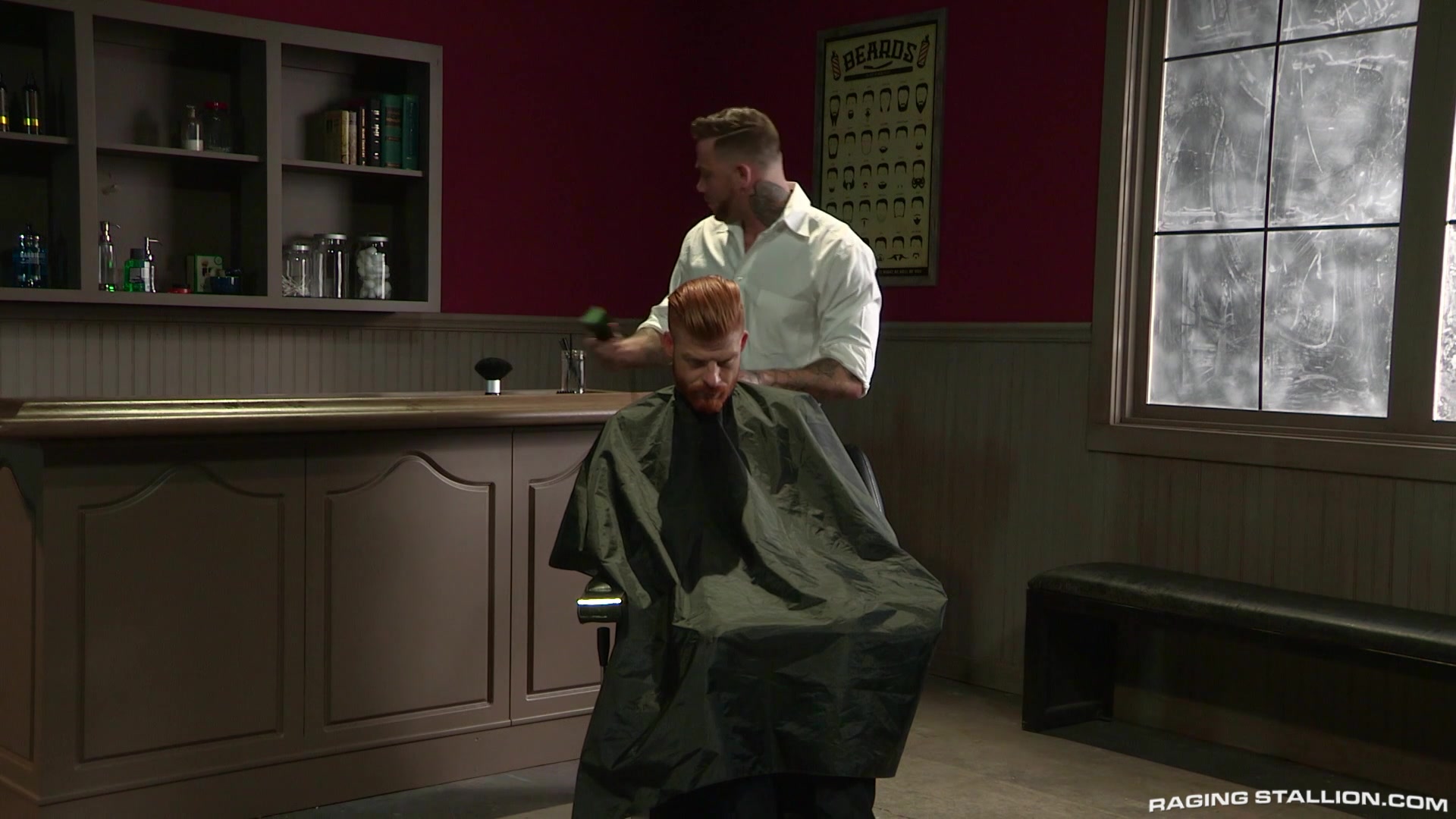 Bennett Anthony sits in the 'High n' Tight' barber's chair as Gage Unkut finishes his work. After touching up the back of Bennett's neck and running a comb through Bennett's bright red head of hair, Bennett stands up and fidgets uncomfortably with his slim wad of cash. He doesn't have enough for a tip, but he hopes he and Gage can 'work something out.' Bennett reaches for the bulge in Gage's pants: a good suggestion. As Bennett wraps his lips around Gage's uncut cock, Gage unbuttons his shirt, revealing his muscular torso completely covered in tattoos. Bennett whips out his cock and pushes down his pants. Kneeling on the barber's chair, he spreads his ass cheeks apart for Gage to dive in face first. As Gage pushes his tongue deep into Bennett's tight hole, Bennett encourages him with moans of erotic excitement. Standing up, Gage pushes his hard cock into Bennett's fuzzy ass and fucks him doggy style. Switching it up, Gage sits in the chair, and Bennett sits down on his cock. Using the powerful muscles in his thick legs, Bennett rises and sinks down on Gage's cock again and again. Bennett's meat bounces in the air as he rides Gage, and his six pack flexes. Gage stands up and positions himself over Bennett to fuck his face. With his hand gripping the back of Bennett's head, Gage thrusts his hard rod deep down Bennett's throat. He unleashes a massive load on Bennett's face that drips into Bennett's open mouth. Just after swallowing Gage's load, Bennett cums with a guttural roar, shooting his white load onto his thick ginger pubes.