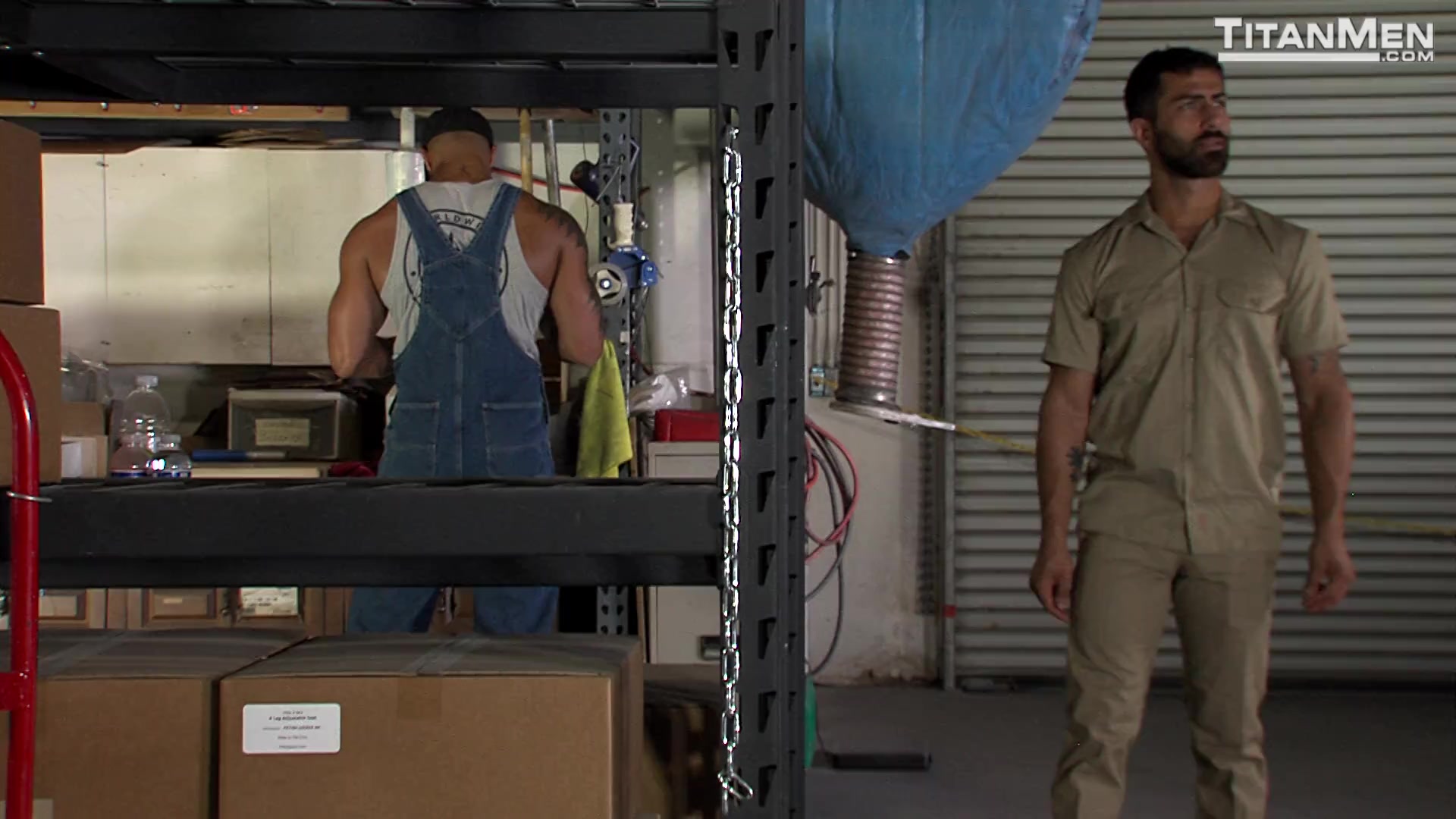 Adam Ramzi has a package for warehouse stud Jason Vario, who tells the deliveryman that they make play gear. “Like for playgrounds?” asks Adam. “No,” laughs Jason, leading him to a sling. “Think a little more adult.” Jason deep throats Adam’s uncut cock, which bursts out of his uniform. Adam bends over for a kiss, beating the sucker’s pecs with his dick. Jason slides off his overalls to release his monster, Adam gasping for breath as he worships it. Jason whips it on the sucker’s face, Adam slapping Jason’s huge pecs. Adam sits on a rim seat, their cocks rock hard as Jason tongues the quivering stud’s hole. Adam sucks Jason as he gets eaten, then gets on all fours. Jason wraps his arm around the bottom, who grips it as he gets plowed (“It’s so fucking big!”). Adam straddles the sling as he gets it doggie style, then gets on his back—his cock bouncing as Jason thrusts inside him. Jason jacks Adam’s load out, then spurts on the bottom’s beard.