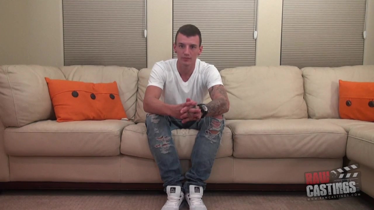 Newcomer Brad has just flown in from Michigan to try his hand at some gay porn. The casting director loves those Midwestern guys, so he got an all expense paid trip to Florida just to get fucked up the ass on camera. Like a lot of guys who are interested in doing porn, Brad swings both ways, but he primarily swings toward the opposite sex. That's fine by us, as long as he can suck a mean dick when he wants to! The ride to the studio from the airport definitely raises the expectations on his BJ abilities, too, since he confesses that he is a fanatic for blowjob porn vids. When he isn't watching sex on his computer, but actually having sex, he says he likes it rough. Brad thinks he is made for sex. We will all find out once he is on the Raw Casting couch! Brad has an intricate sleeve tattoo. He is quite proud of it, and he plans on inking his entire body up some day. He certainly has gotten a good start. He has many tats on various parts of his body. His body itself is decent shape - he is definitely a good looking guy, just the kind of guy we like to cast. He attempted to do porn once before, but he says that he and the producer didn't get along, and that he got stranded out of town. That's good news for us, because that means his ass is still virgin tight! Although he has messed around, he has never had a guy fuck him before, he says. There’s a first time for everything, and it looks like Brad’s first time will be on camera. Once the action starts, Brad stays hard sucking cock, and he does a fairly good job using his mouth as a pleasure tool. He wraps the casting director's entire cock inside his hand and mouth. The way Brad gives a blowjob seems to be with the intent to get a nut in his mouth as quickly as possible. Are there still gloryholes in Michigan, anyone? Maybe he gets a lot of practice. Once he is getting barebacked, though, he puts up a bit of resistance and complains mildly. The casting is fucking him at a normal pace at first, and Brad exclaims, "You're gonna fuck the freckles off my butt!" After a bit of time, though, it gets easier. He gets barebacked like a little bitch in missionary position, riding, and bent over the couch. It's when he is flat on his stomach with his ass in the air, though, when he looks his best. Brad cums first, and then the casting guy cums all over his ass. In regards to losing his butt virginity, he says that it was painful at first but not too bad. It looks like we have another successful recruit!