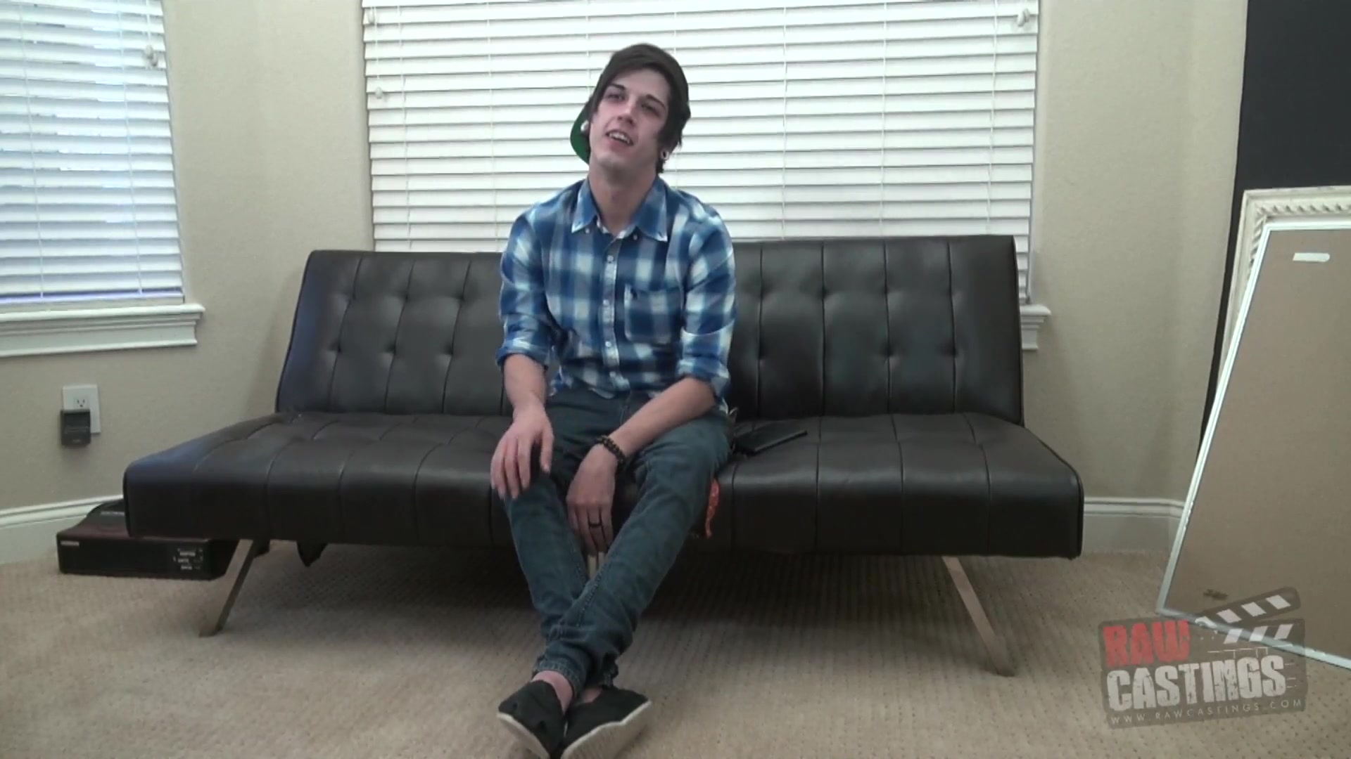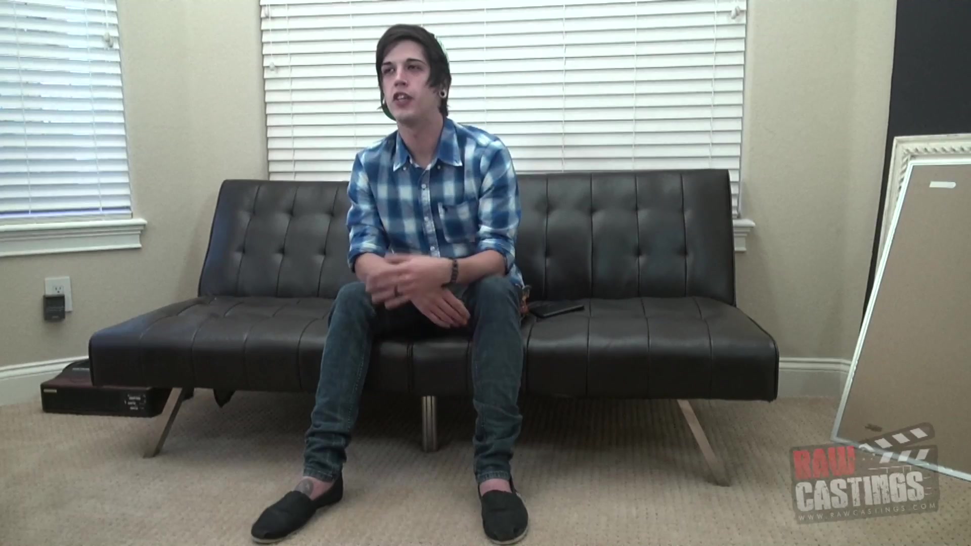 The casting director has Kyler on the couch today for a raw casting. Kyler is 23 years old, and he has a bit of an emo look going. His straight black hair underneath a backwards cap, gauges, and his outfit indicate that he is an alternative type of guy. Kyler professes to be bi, but he doesn't have a lot of experience getting fucked. Once a guy with a 9 incher tried to fuck him, and Kyler didn't like it much. Kyler, though, needs the money, so he wants this porn job badly. His waiter job just isn't cutting it. When asked about what he likes sexually, he says that a mutual experience is the best - where both guys are verse and equally aroused and satisfied. The director gets Kyler out of his clothing as he snaps some photos. Kyler has some tats, but not too many. His body is average, but his butt looks fuckable. Kyler doesn't mind being nude, but he insists on keeping his cap on, saying that it is "his signature look." Once Kyler is stroking it on the couch, he reveals a nice thick cock. The casting guy doesn't want to waste any time, so he pulls out his cock, too. Kyler is down on it sucking away before you can blink. The guy definitely likes dick! He doesn't have a gag reflex, and he makes a lot of noise while giving a blowjob, which is good. After getting some grade A head from Kyler, the director sticks it bare into this newbie's hole. Once Kyler is on his back, you can see that he has a hairy / otter thing almost going on. As the director's dick slides in and out, Kyler moans sensually and jerks himself off. While he can take a fucking with ease, he doesn't seem to have much pizzazz. Nonetheless, his hole must feel great because the casting director doesn't let up. He fucks and fucks away, even giving Kyler some light face slaps to test out his tolerance to being treated like a bitch. That does the trick, because shortly thereafter, Kyler asks for it harder and busts a nut while he is getting barebacked deep. The casting guy cums immediately thereafter, cumming all over Kyler's ass. Bareback Casting Complete!