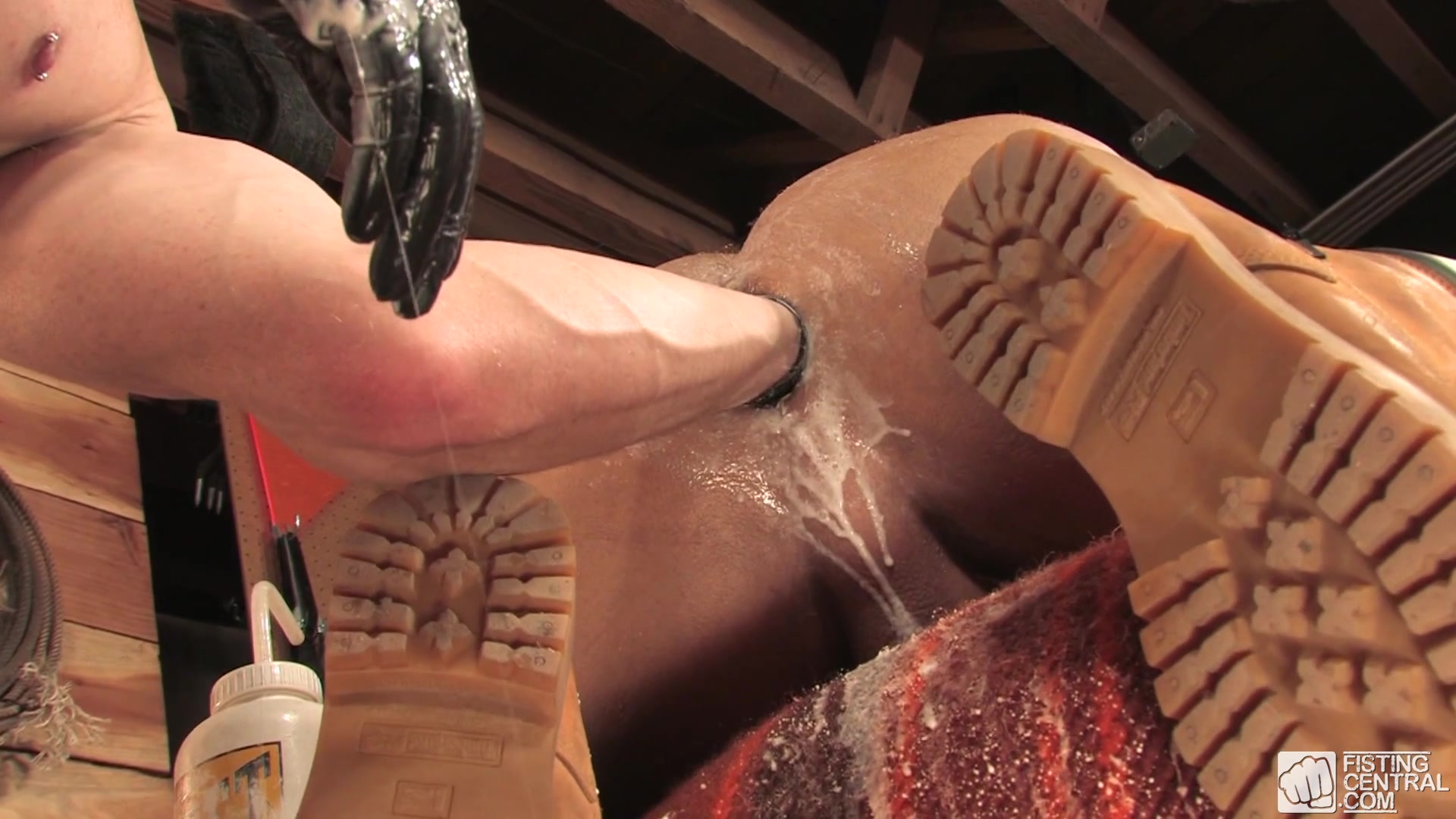 Erik Rhodes is on all fours in the tool shed his asshole begging to be filled with Billy Berlin's fists. Billy gets right to business, sliding his lubed hand inside Erik's anxious hole. Billy loosens Erik, and starts to pry open the big man's crack. Alternating fists, Billy slides right then left, the right again and exposes Erik's massive rosebud, massaging it into full bloom. This massive stud can really take a fist well and you can see he is fully enjoying it with every digging stroke that Billy delivers. Erik's so into it that he gets up on his feet and startsbounding up and down on Billy's stationary fist. Laying back to really take the full force of Billy's fisting talents, Erik spreads his legs and jerks his huge cock while Billy kneads his hole until streams of cum flow out of his cock and his pucker releases fully in a grand finale that ranks as one of the top fisting scenes ever filmed!
