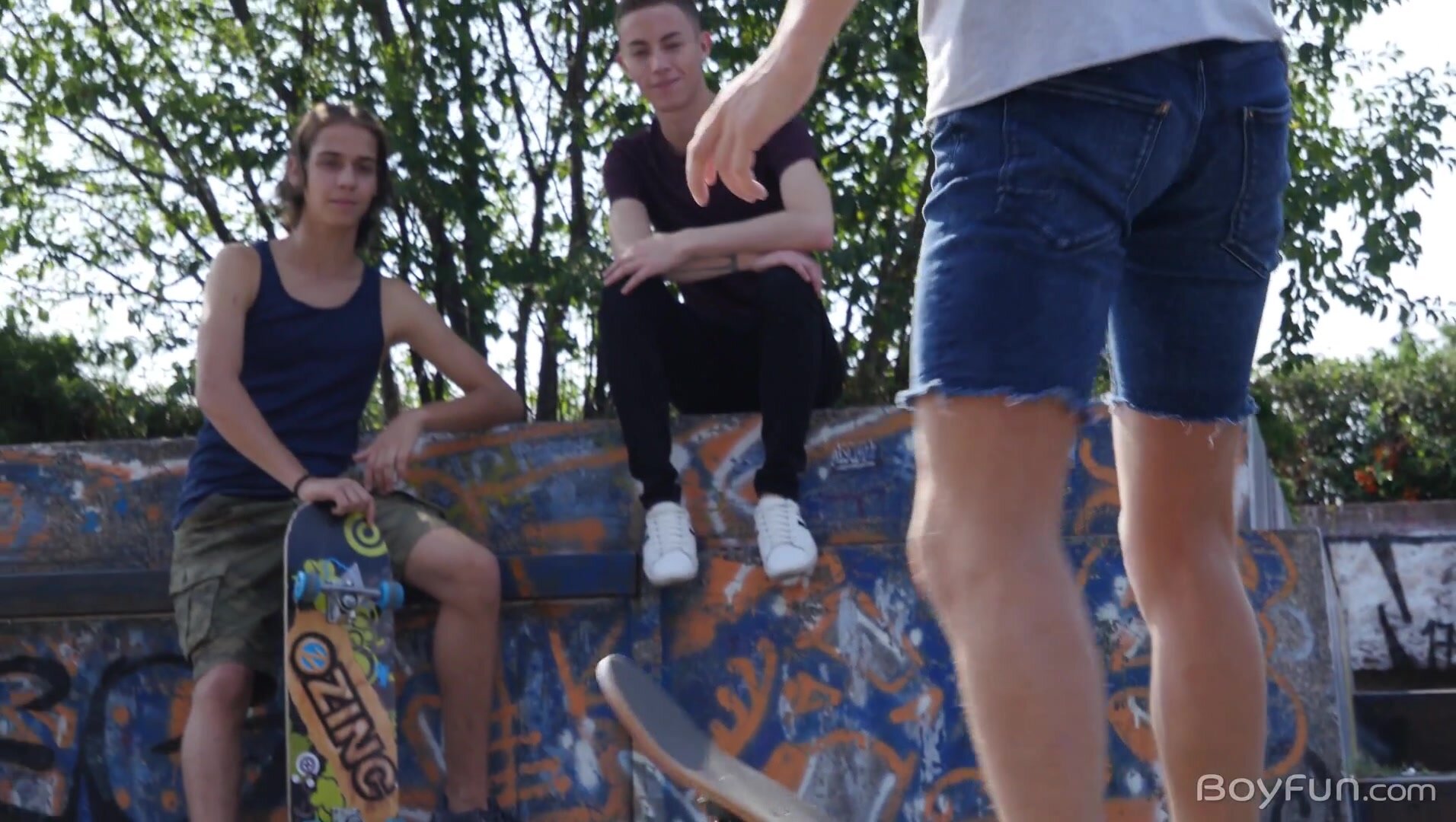 Every teen these days knows that if you want to find some fit and curious twinks to share your cock with the skate park is one of the best places to be. Alec Loob might not be too good with his board, but he's not really there to show off his lack of skills, he's there to get the attention of long-haired boy Jake Olsen. His flailing seems to do the trick and while Jake might have originally considered just giving the boy some tips on his learning method he's soon following the twink back to his place for some dirty BoyFun! Alec might not be great on wheels, but when it comes to sucking on big uncut cocks he's had plenty of practice. The boys make out, revealing their incredible young dicks, jerking each other off and swapping oral with obvious delight. Jake's incredible dick is so long and slender, so tasty too, and with just a little taste Alec is desperate for more. There's no denying that these boys are well-matched in the cock department, and in their skills at pleasuring a wet young piece of fuckmuscle too! With their young swinging balls slowly filling with cum to squirt Alec is eager to get that big bare boner up his butt, laying back to welcome his new friend inside. The smooth and slim twinks ae quickly in heaven, their moans of bliss filling the room while adorable Jake gives his friend a ride on his uncut shaft. With their balls bouncing and their dick tips almost dripping pre in anticipation of the climax to come the two break for a moment of ass-to-mouth oral, then it's right back to the hole filling action they've come to love so much. Pounded from behind and with the pleasure becoming too much to bear Alec squirts over his stomach, the sight and smell of fresh semen enough to have Jake pulling his incredible dick out and wanking his own erupting cream from his shaft! Maybe Alec should forget the skateboard and stick to fucking, it's where his innate skills are!