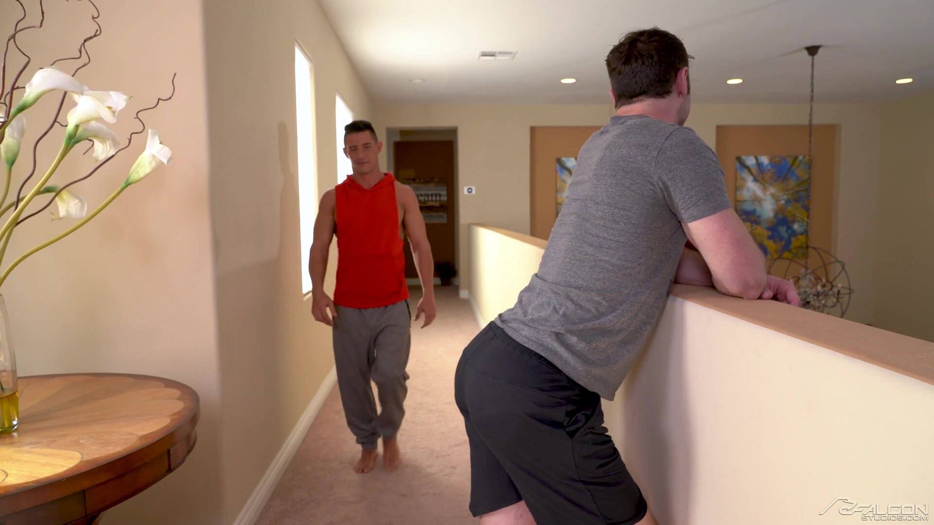Michael Boston is minding his business in the game room shooting a round of pool when hung muscle-stud Jax Thirio passes by and lures him away from the table. When they head upstairs, Jax is taken by Michael's insatiable bubble butt and helps himself to a mouthful of his buddy's smooth hole. To give Jax better access, Michael hoists his leg up to give his hot friend total access to his crack. When Jax pulls his shirts down to reveal his pulsating cock, Michael can't help but get on his knees and service Jax's fat cock on the spot. After Jax has had his fill of fucking Michael's throat, he sets his sites on drilling his hole, so he bends the bubble-butt stud over to fuck his tight ass, raw. Michaels takes it from the back before they move to the stairs and Jax drills Michael's hole on the top step. After taking one last taste of Michael's ass, Jax flips him upside down and pounds Michael's hole while he balances on the stairs. Michael's hole is too hot for Jax to handle so he glazes his buddies' sore hole with his cum, then shoves his cock back in. With Jax deep inside of him, Michael strokes his big cock until his spills his wad onto his sweaty abs. Seeing Michael covered in his own cum sends Jax into overdrive and he laps up Michael's load so they can seal their deed with a wet, cummy kiss.